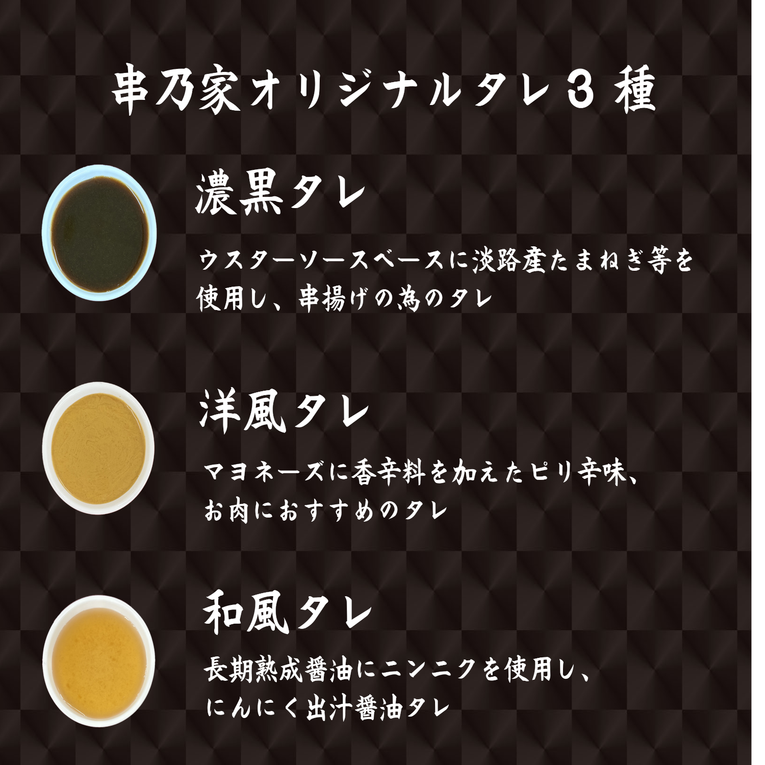 濃黒タレ・・・玉ねぎのコクと甘味が広がる素材本来の味を引きたてるタレ