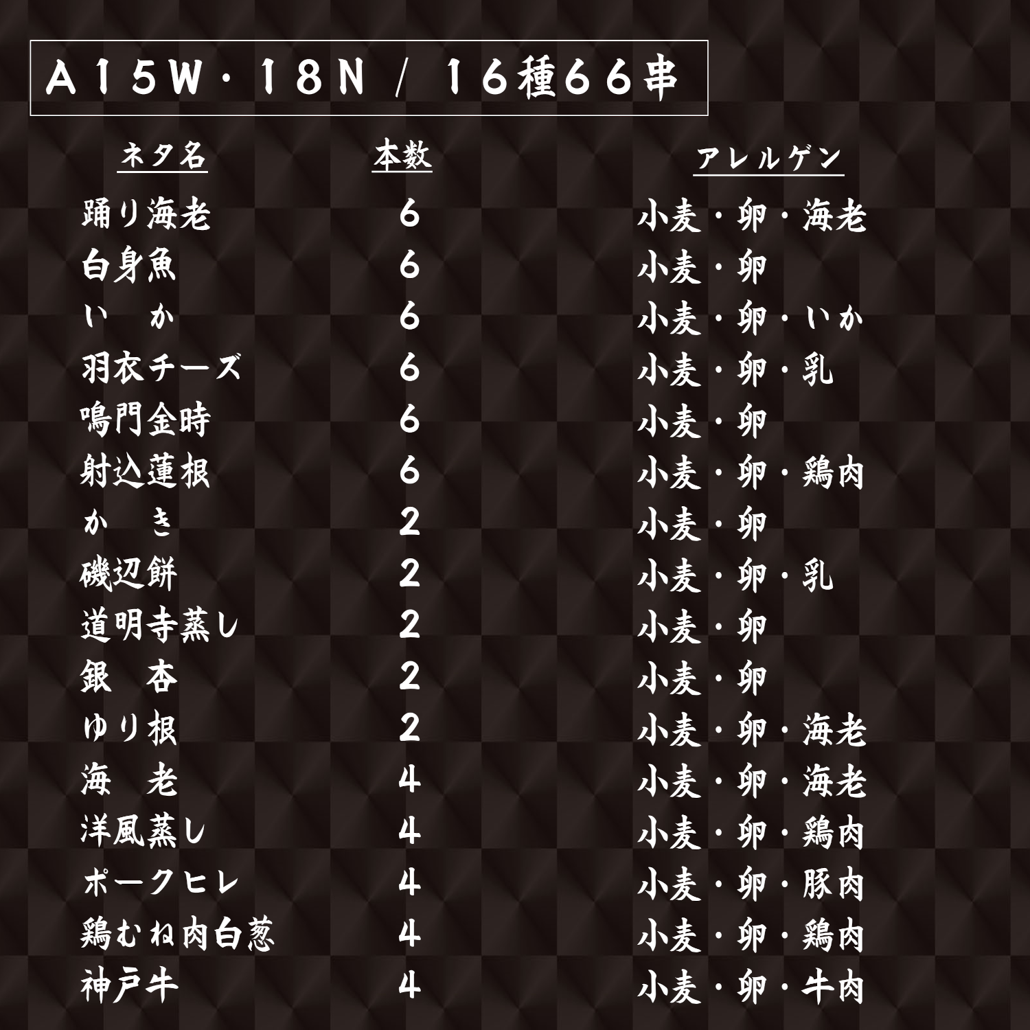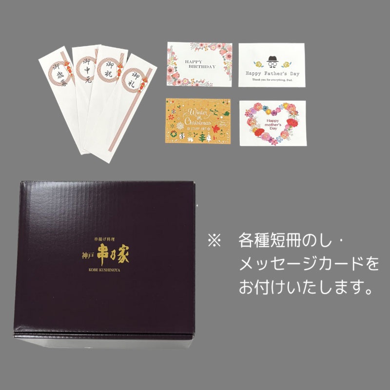 串揚げ料理専門店【神戸 串乃家】の定番串・人気串に季節串をくわえた16種66串のセットです。
