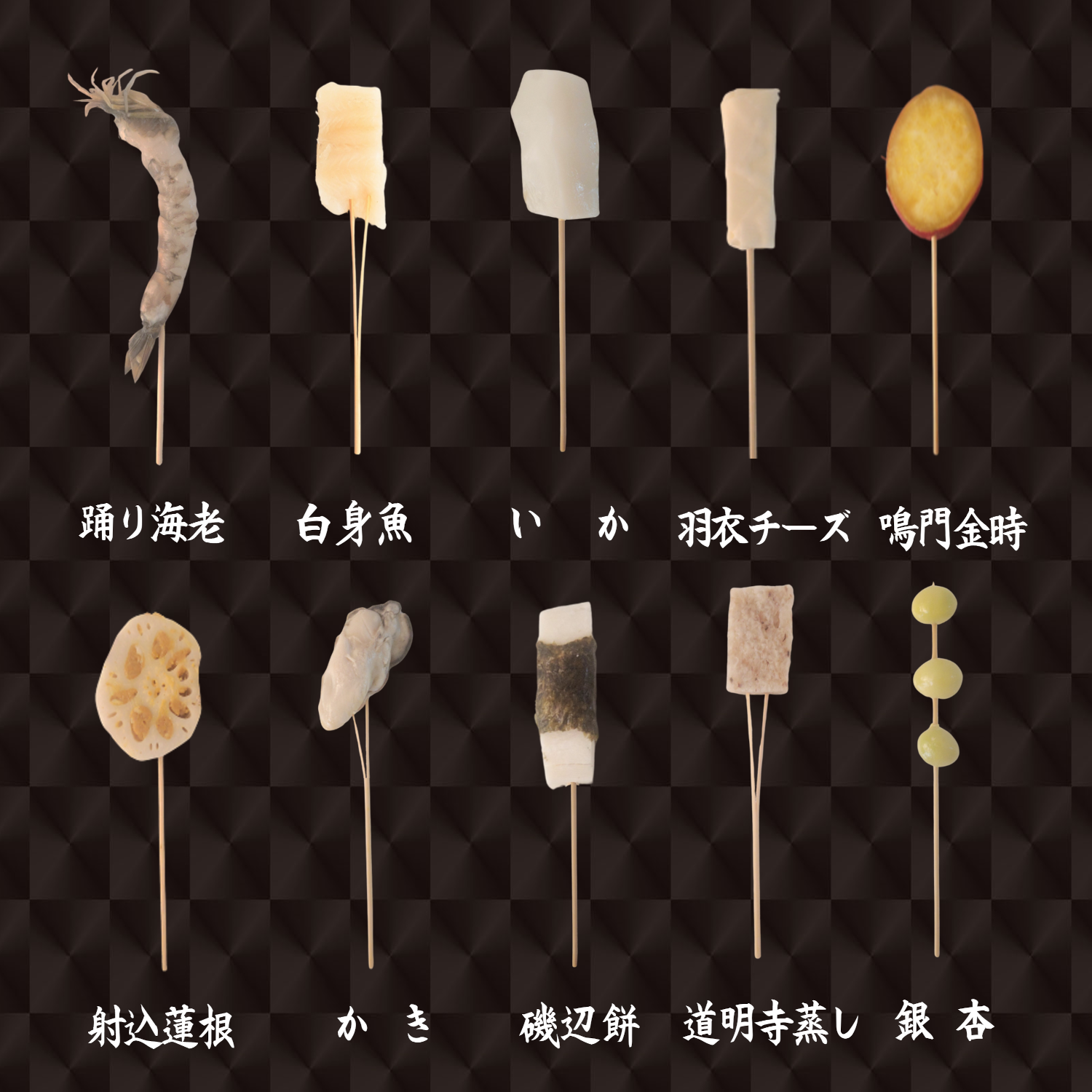 踊り海老、白身魚、いか、羽衣チーズ、鳴門金時、射込蓮根、各6