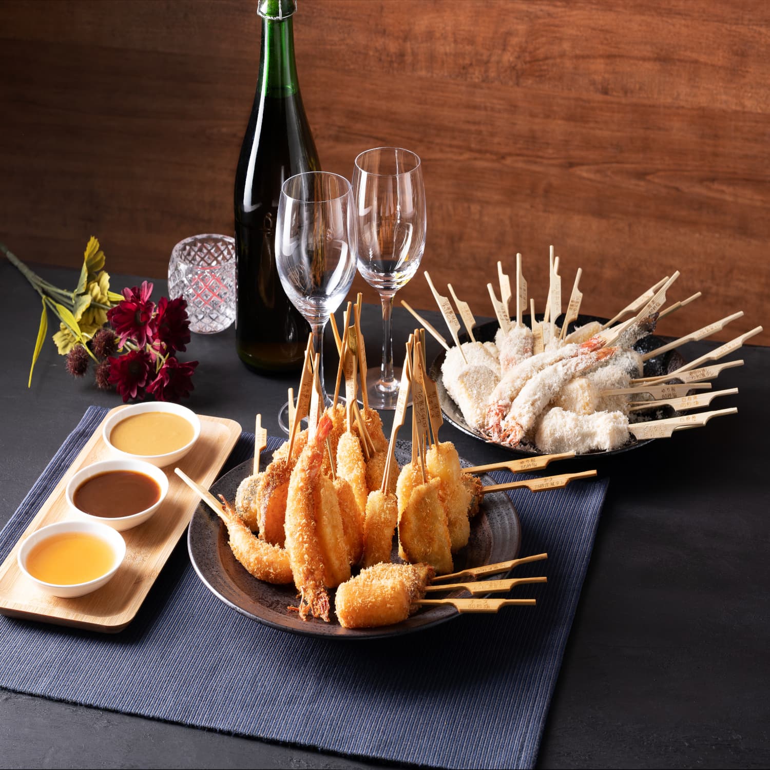 多彩な素材を使った串揚げが16種類も楽しめ、バラエティ豊かな味わいでみんなでの楽しい食事シーンを演出します。