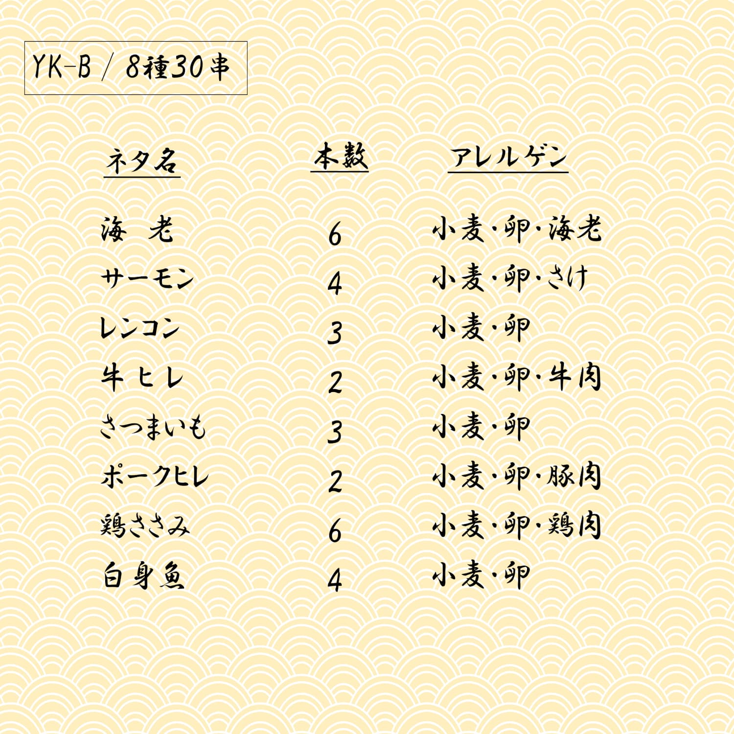 海老、鶏ささみ 各6、サーモン、白身魚 各4, レンコン、さつまいも 各3